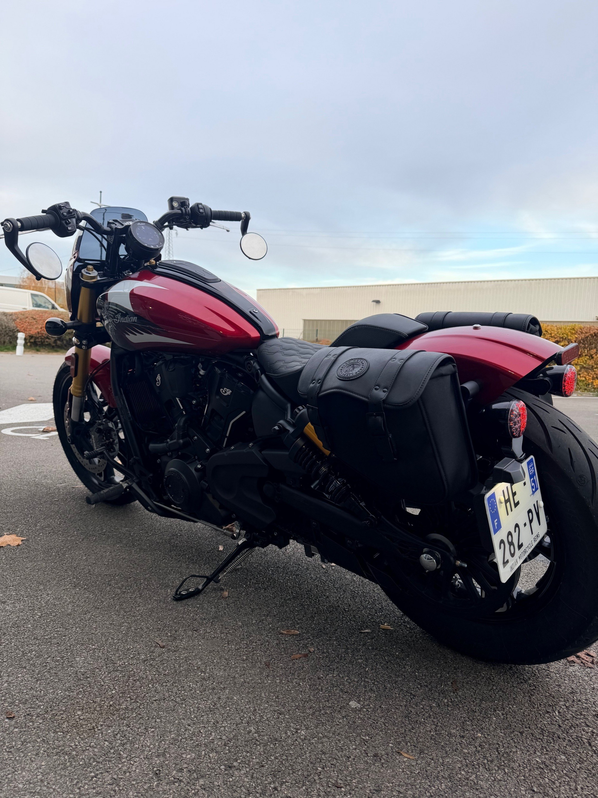 Moto equipé d'un silencieux S&S avec deux sacoches cuir INDIAN, GPS / régulateur / démarrage sans cléf / mode de conduite / prise USB.